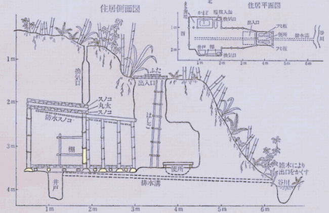 食生活では、ソテツの実・ヤシ・パンの実・川エビ・ウナギ・カエル・デンデン虫(カタツムリ)などを食べ、 穴を掘って居住し、簡単な換気口や排水路を設備していました。刃物と火がなく不便であったこと、ゴキブリが多く大変であったといいます。